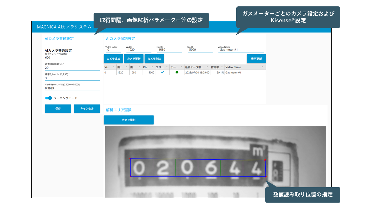 工場や大型商業施設などで設置されているガスメーターを安価なWebカメラで撮影し、AIが数値を読み取ってデータ化するというユニークな仕組みです。