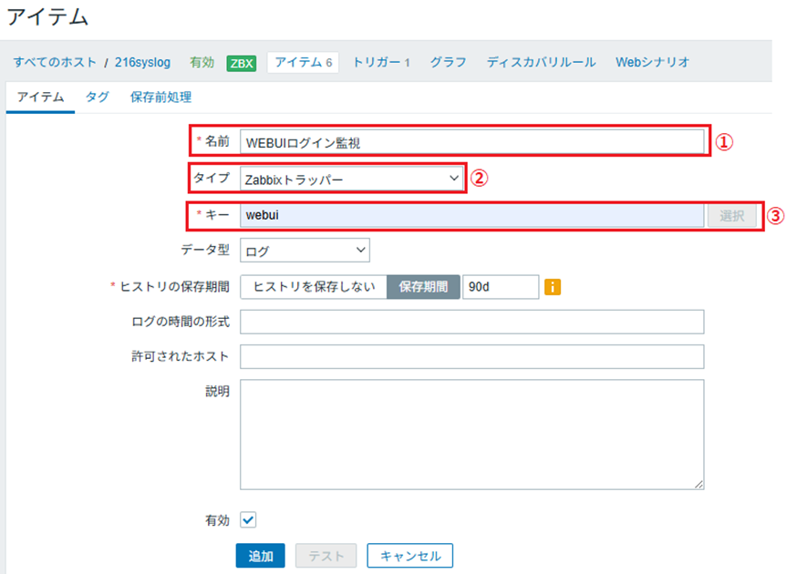 設定箇所はログ送信元ホスト名(IPアドレス)、メッセージ内容、ホスト名、アイテムキーです。