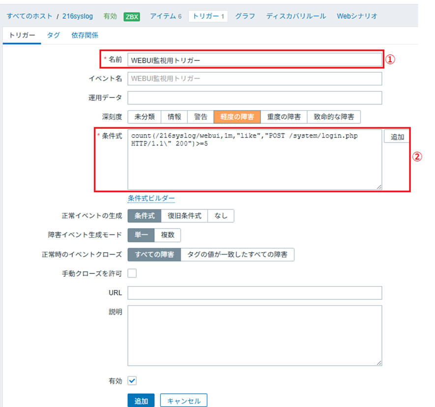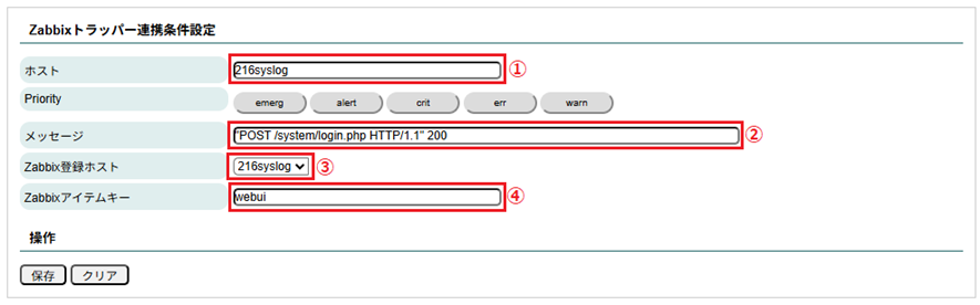 どのようなログをZabbixサーバーへ転送するかの条件を設定します。