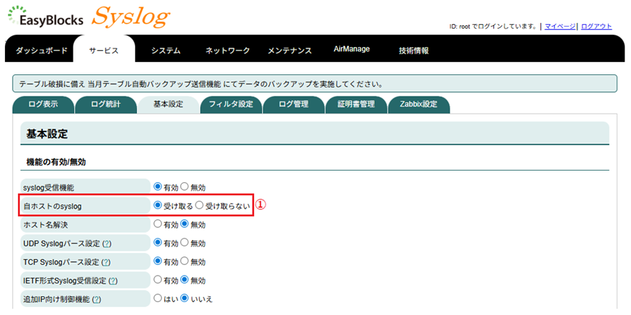 設定箇所はサービスの基本タブにある自ホストのsyslogを受け取ると設定するのみです。