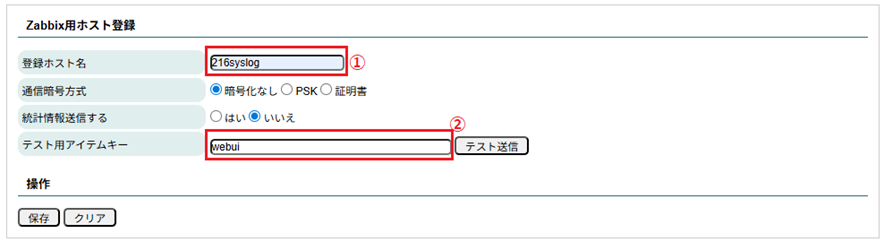 Zabbixサーバー側で登録したホスト名、アイテムキー情報を登録します。