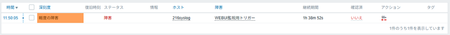 Zabbixの障害画面を開き、設定したトリガー条件通りに障害として判定されているかを確認します。