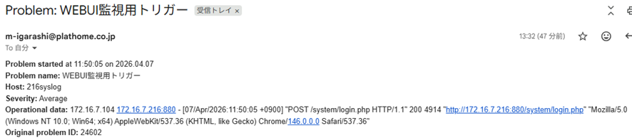 今回はメール通知と紐付けていたので以下のようなメールを受信しました。