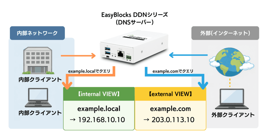 VIEW機能は、クライアントの接続元(IPアドレス等)に応じて異なるDNS応答を返す機能です。