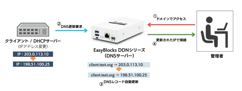 DDNS(ダイナミックDNS)機能は、IPアドレスが変動する環境においても、ドメイン名とIPアドレスの対応関係を動的に更新する機能です。クライアントやDHCPサーバーからの更新要求により、DNSレコードが自動的に更新されます。