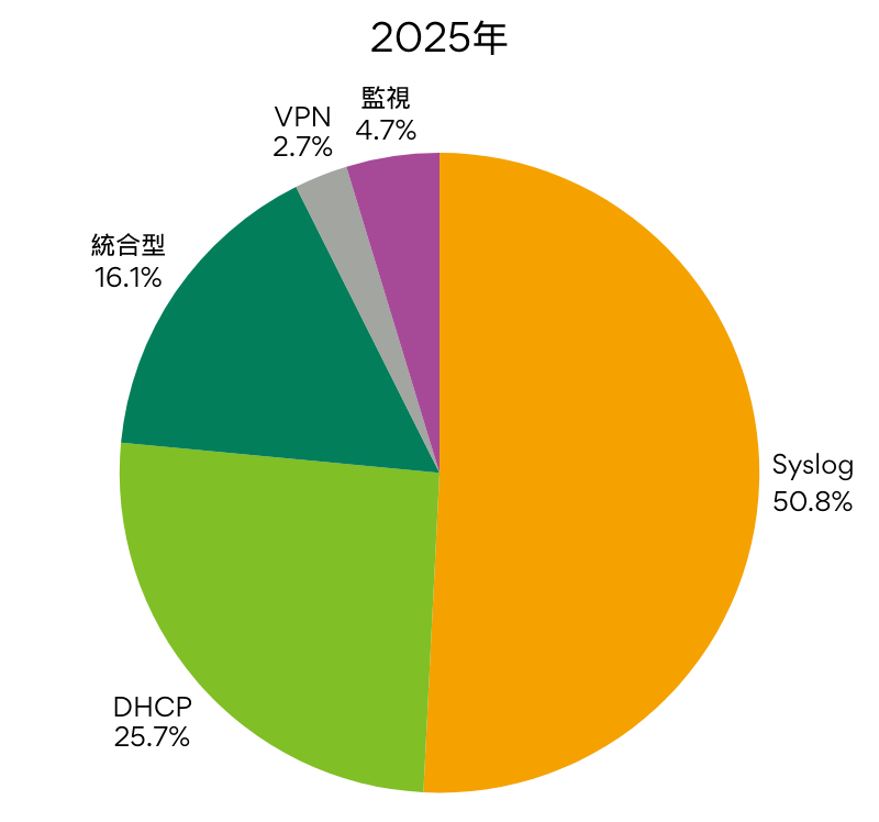 先日の星くんのブログでも記載がありましたが、2025年はSyslogシリーズとDHCPシリーズが中心となり、この2つのカテゴリーだけで全体の4分の3以上を占めています。