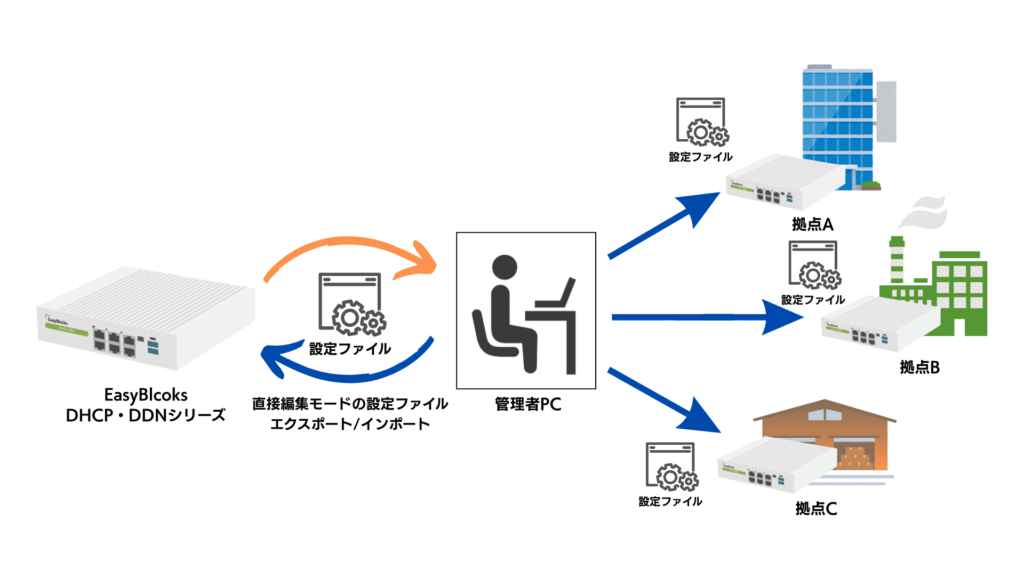 直接編集モードでしか変更できない設定をローカルにバックアップできます。また、バックアップした設定ファイルを複数拠点に一括展開することも容易です。