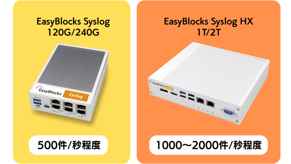 ストレージ容量が120GB等のモデルでも500件/秒程度まではログデータを取りこぼしなく受信・記録が可能です。また、1TB,2TBのモデルであれば、瞬間的に1,000〜2,000件/秒程度のログデータも受信・記録ができます。