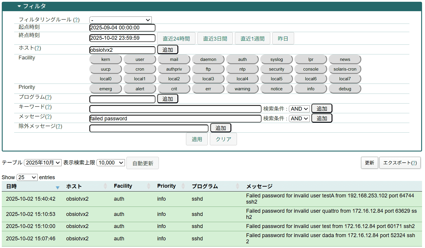 起点時刻や終点時刻、メッセージのフィルタを設定すると、過去1ヵ月間に起きたログインエラー「failed password」を確認することができます。画像のように、ホストを指定することで特定の機器のログインエラーのみを確認できます。