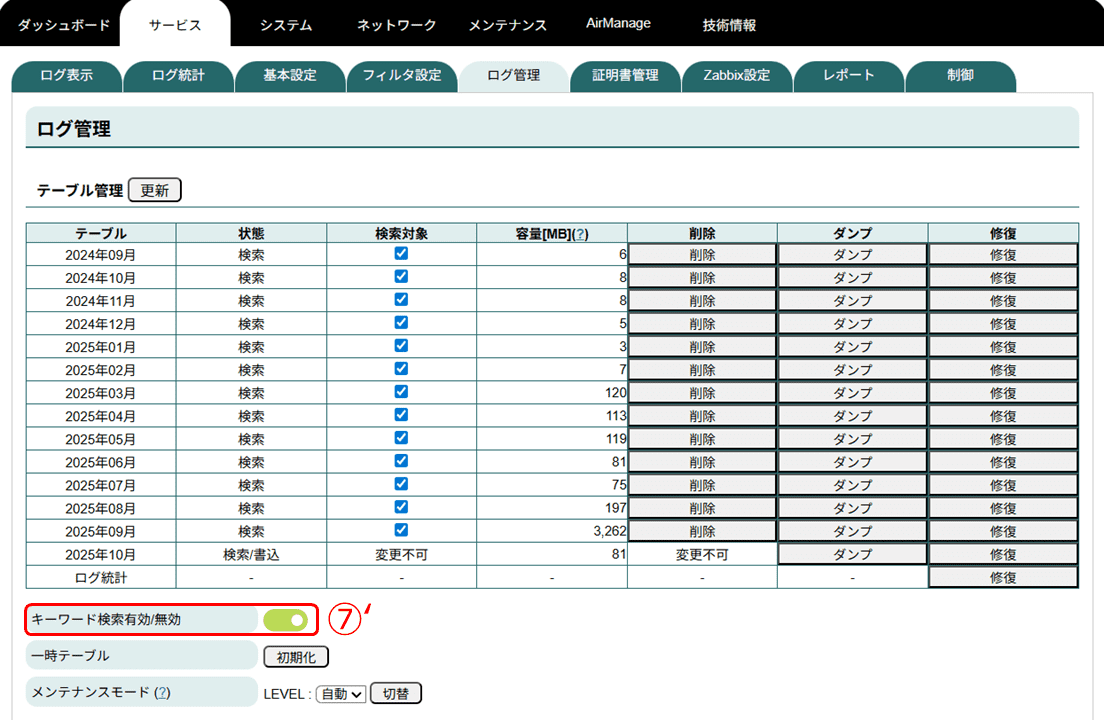 ⑦キーワードのフィルタを利用する際には、サービスのログ管理タブの⑦’ [キーワード検索有効/無効]を有効にします。