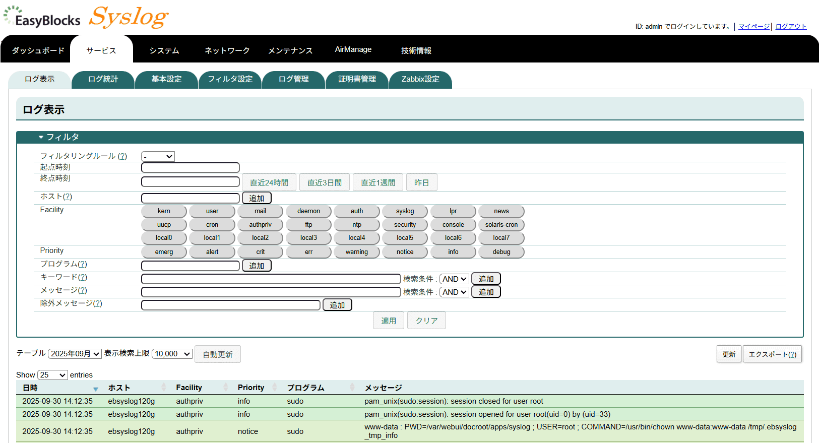 EasyBlocks Smart log seriseでは、ログを貯めるだけでなくWeb UIから表示するログのフィルタリングも可能です。そのため、機器の問題や不正アクセスなどが発生してしまった場合でも、その時に出力されたログをWeb UIから確認し、問題への対応や対策に役立てることができます。