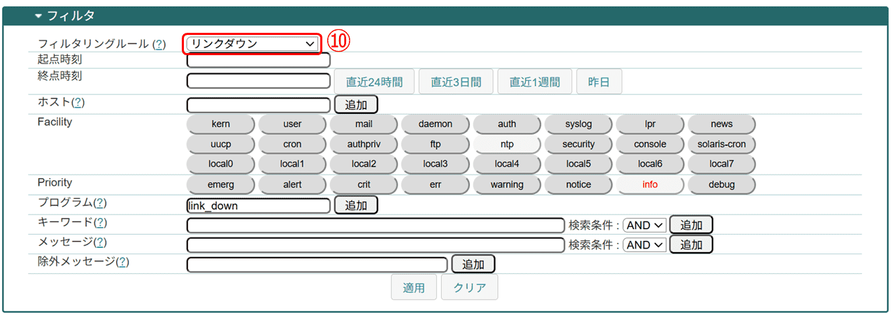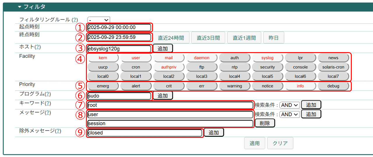 ④ Facility:フィルタをかけるFacilityを各項目から指定します。複数指定の場合、OR条件となります。