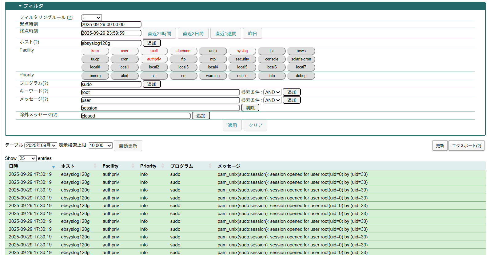 フィルタの設定後、[適用]をクリックすることで設定したフィルタの条件と合致したログが表示されます。これにより、見たいログのみを表示させることができます。