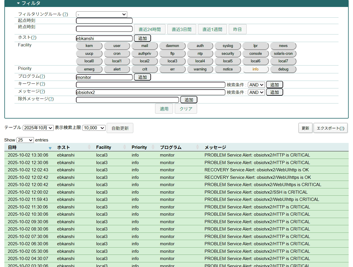 ・ ホスト、Facility、Priority、プログラム、除外メッセージはOR条件となる。