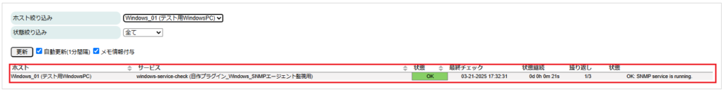 ①監視対象のWindowsマシン上でSNMPサービスが稼働しているため、OKという判定になります。