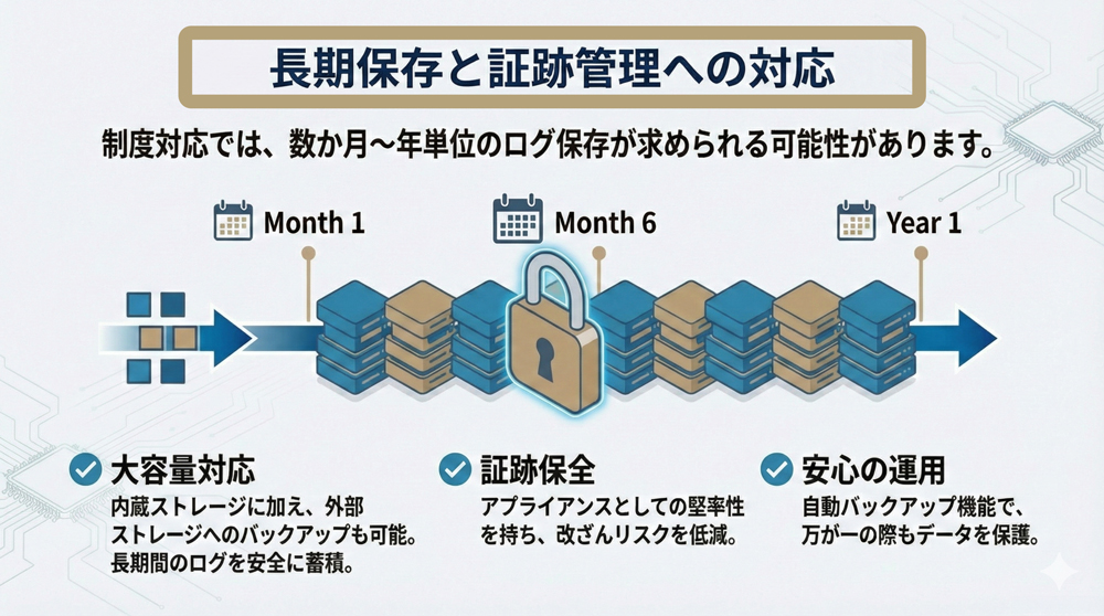 制度で想定される可能性がある、長期のログ保存要件についても、内蔵ストレージや外部ストレージへのバックアップを活用し、安全に運用できます。