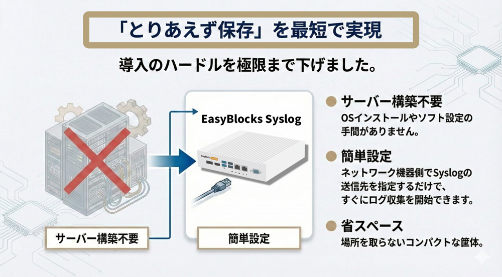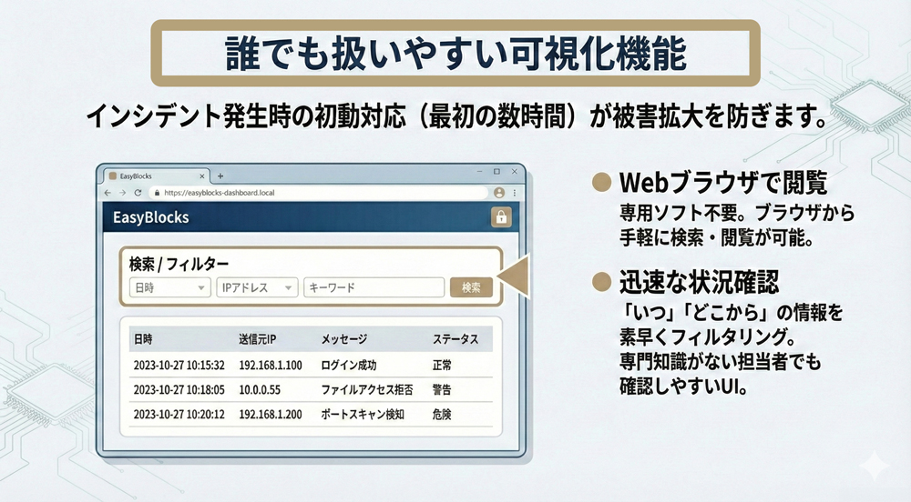 当社の「EasyBlocks Syslog」は、今回の制度構築方針(案)で重要性が示唆されている「ログの収集・保存・可視化」に特化した専用アプライアンスです。