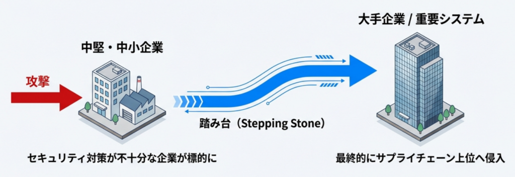 近年、サイバー攻撃の手口はますます巧妙化しており、セキュリティ対策が十分でない中堅・中小企業が攻撃の踏み台となり、最終的に大手企業や重要システムが侵害される事例も少なくありません。