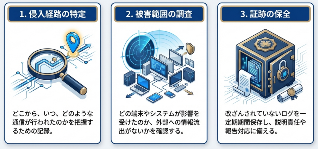 改ざんされていないログを一定期間保存し、説明責任や報告対応に備える