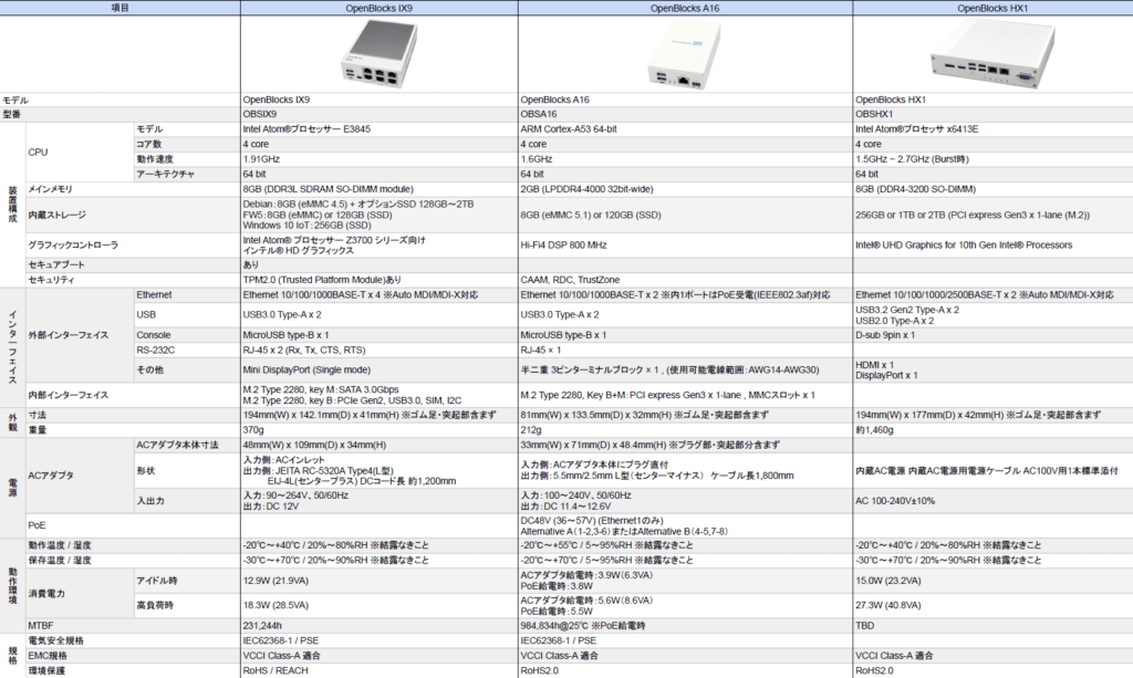 比較対象となるOpenBlocksシリーズは、以下の3種類です。