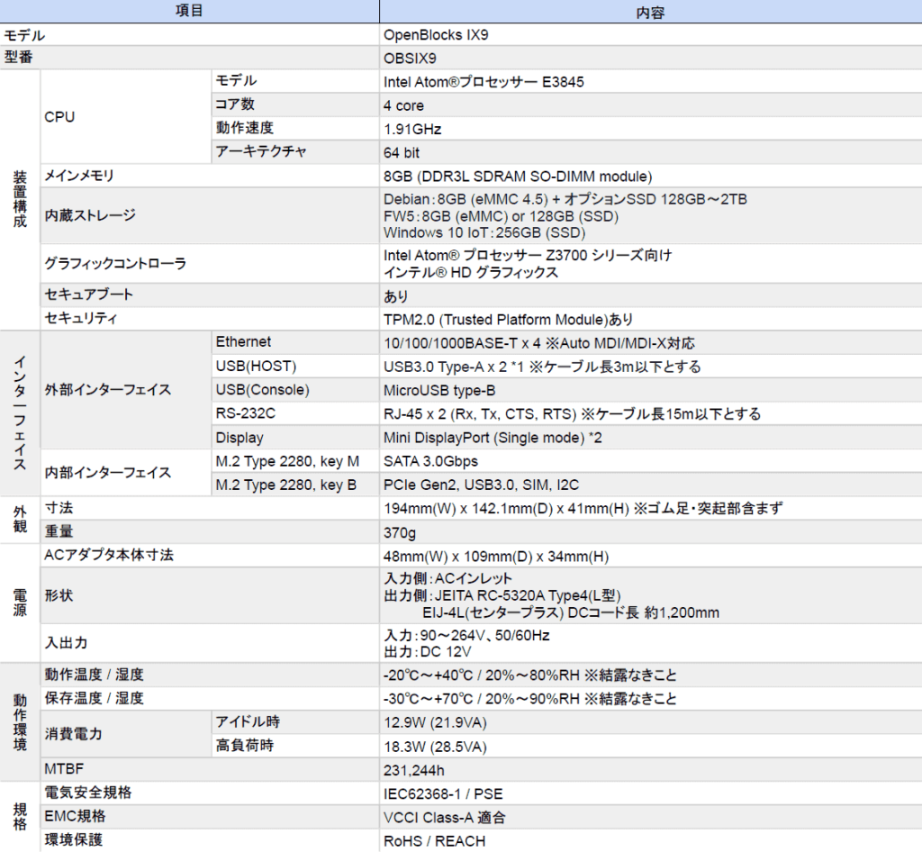 OpenBlocks IX9は、OpenBlocksシリーズの中でも汎用性に優れたモデルです。ラインナップはDebian、FW5、Windows 10 IoTと幅広く、用途に応じた選択が可能です。なお、ライナップごとに内蔵ストレージが異なりますが、Debianモデルの場合は、オプションからSSD128GB~2TBを搭載可能です。