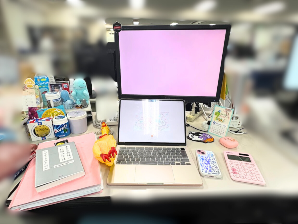 Macの打鍵感が好みで外付けキーボードはなし。デスク小物はピンクで統一され、作業環境も明るい印象に。ちなみに倉持のデスクです。(Apple Keyboardの導入を検討中とのことでした)