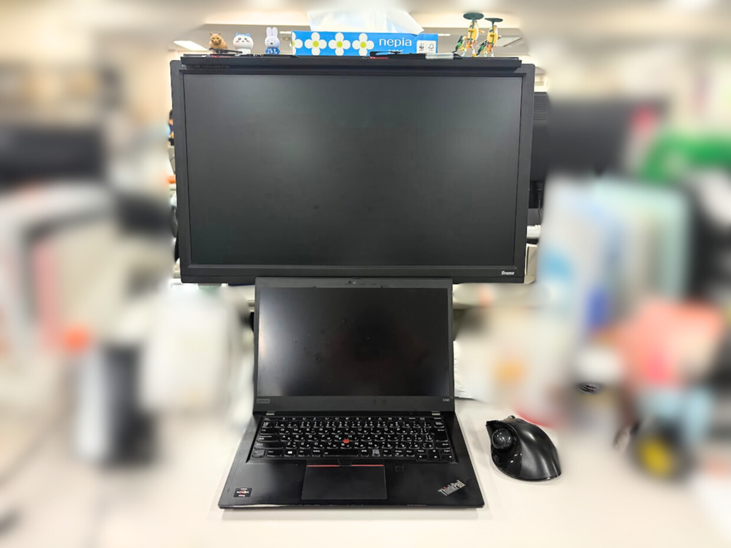 ノートPCの移動がすぐに行えるように、USB Type-Cケーブル1本で接続しています。(ちなみに清水のデスクです)