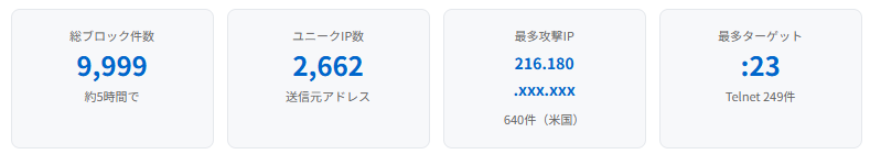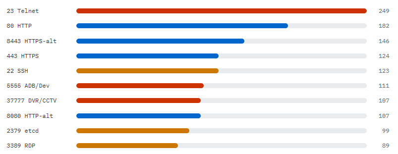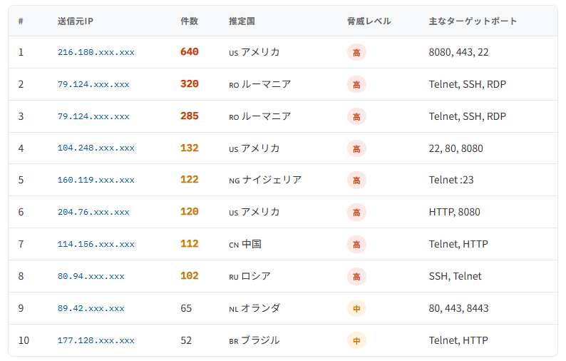 最多は Telnet(23番)249件。古いルーターやIoT機器への侵入を試みる、いわゆるMirai型ボットネットの典型的な動きです。SSH(22番)やRDP(3389番)へのアクセスも多く、デフォルトパスワードや弱い認証情報を片っ端から試す総当たり攻撃と考えられます。
