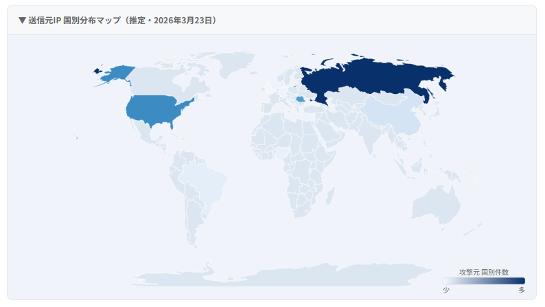 送信元IPをジオロケーション(推定)で国別に集計し、世界地図に可視化しました。色が濃いほど件数が多い国です。